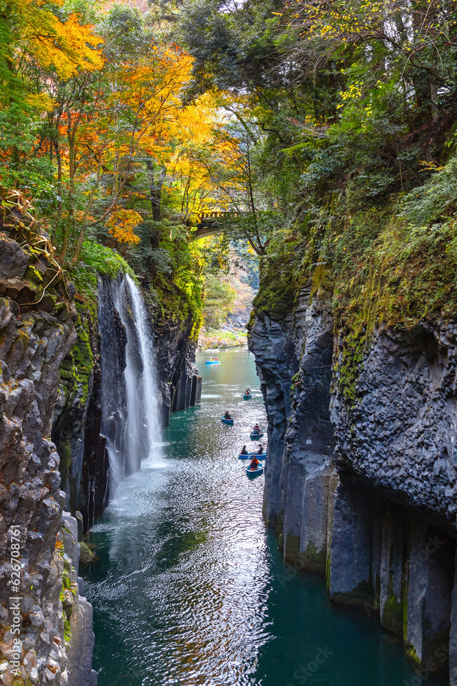 Miyazaki, Japan - Nov 24 2022: Takachiho Gorge is a narrow chasm cut through the rock by the Gokase River, plenty activities for tourists such as rowing and trekking through beautiful nature