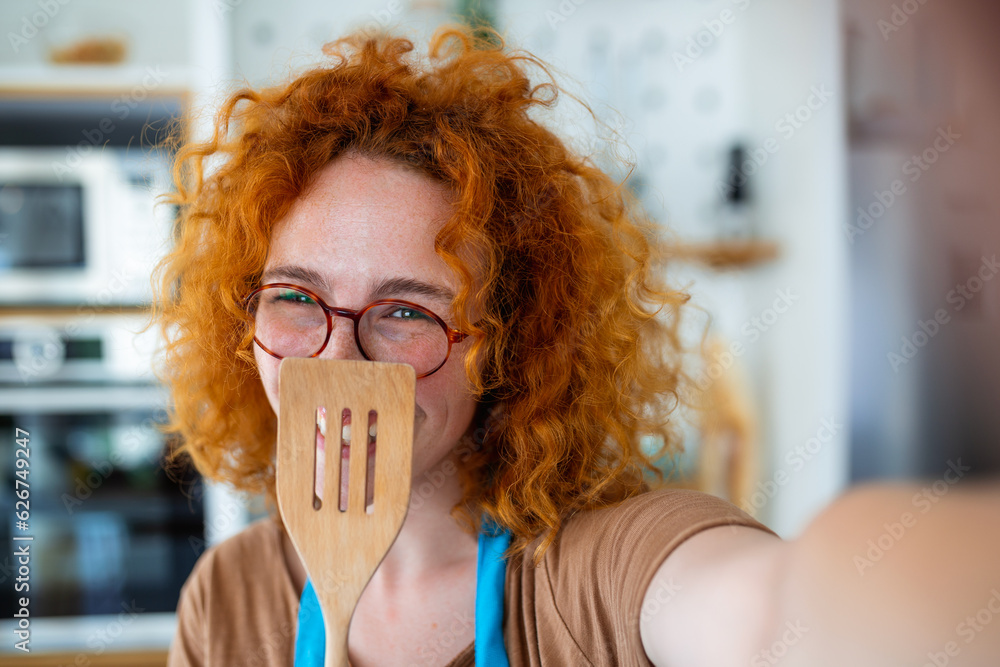 Young ginger woman,food blogger, snaps a selfie with a wooden spoon. Her radiant smile and the culinary delights surrounding her create a captivating blend of self-expression and gastronomic artistry.