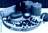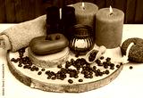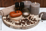 Naturkosmetik mit Kaffee: Shampoo mit Kaffeebohnen und Seife auf einem Handtuch