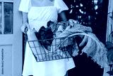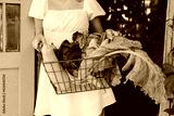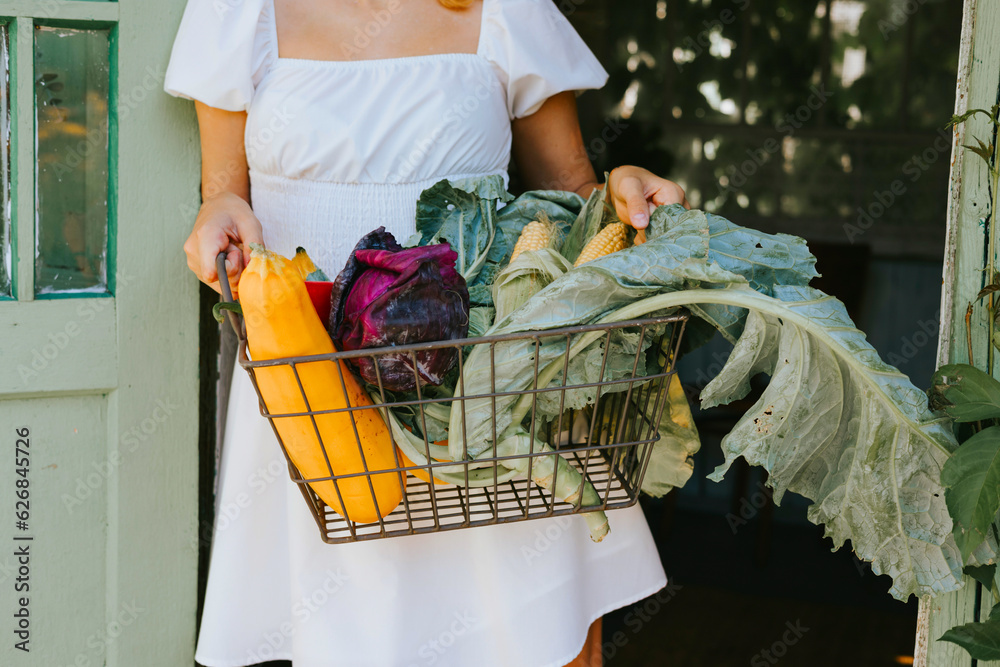 cute farmer teenage girl in casual white dress sits on veranda of country village house with basket of vegetables, eco-friendly food from garden, rich autumn harvesting