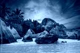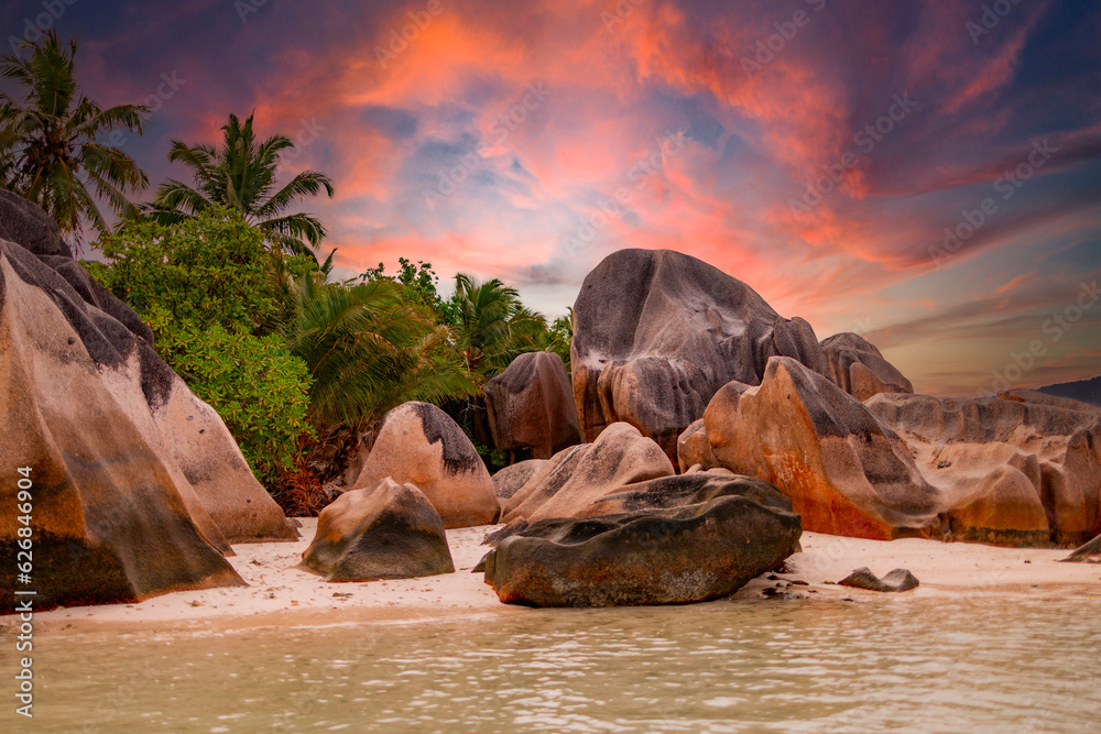 picturesque bright nature in Seychelles, granite stones on Anse de Source d’Argent beach, epic sunset