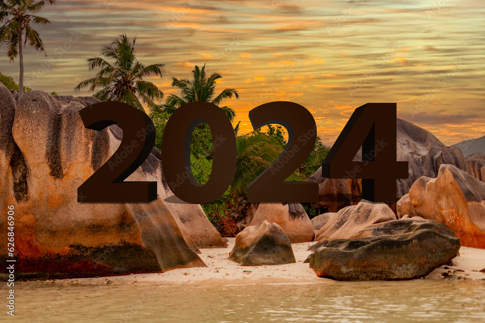 2024 numbers on picturesque bright nature in Seychelles, granite stones on Anse de Source d’Argent beach, epic sunset