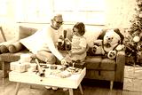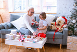 Christmas family grandmother and granddaughter sit on sofa near Christmas tree and preparing handmade New Year gifts, pretty girl and active happy senior woman knitting and sewing toys in apartments