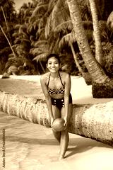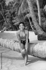 Beautiful girl playful with fresh coconut on the tropical sea beach.