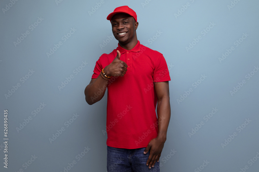 branded clothing concept. american man wearing a red t-shirt and cap on the background of ss copy space