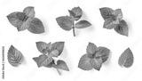 set / collection of fresh green mint leaves, twigs and tips in different positions isolated over a transparent background, cut-out cooking / food, cocktail, tea or essential oil design elements, PNG