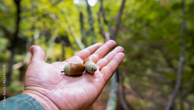 Acorns in hand in forest