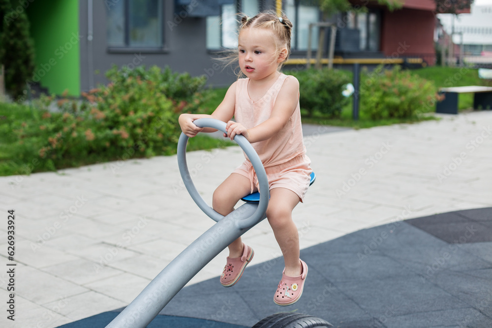 Little toddler girl having fun at playground. Educational playground equipment. Sensory experience.
