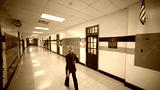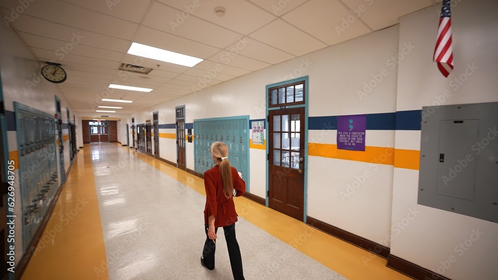Wide angle view of back of teacher walking down empty school hallway with US American flag.