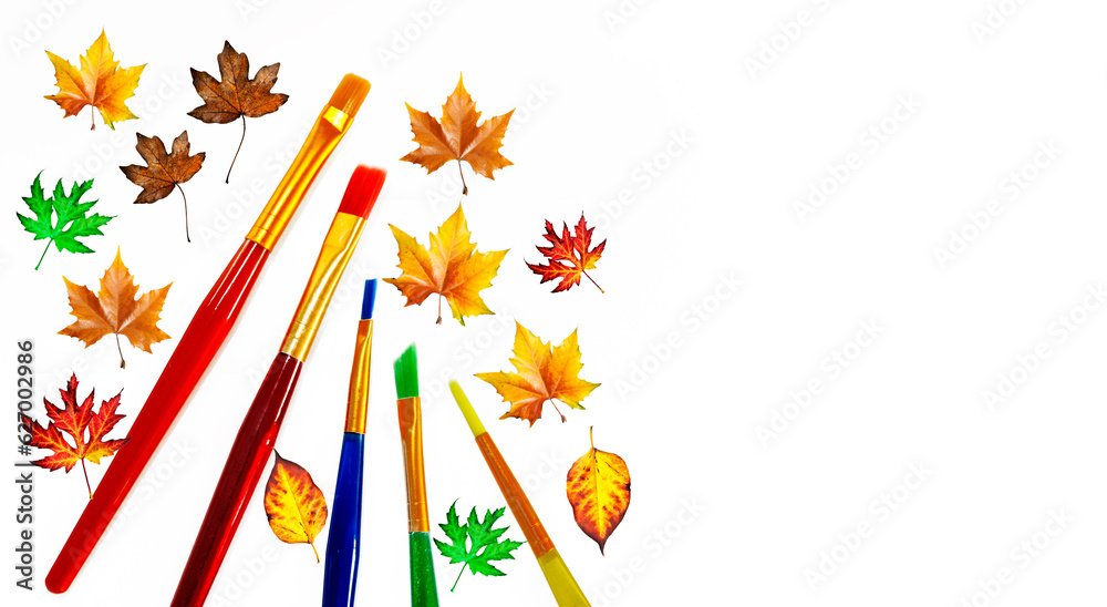 artistic pain brushes of various colors with autumn leaves like romantic autumn jolly art background with copy space