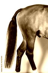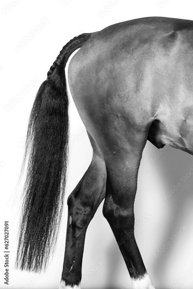 Black and white studio portrait of expressive beautiful horse with black mane and tail