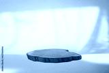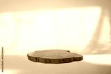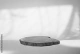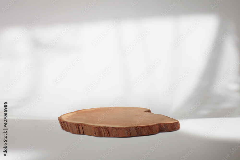 Wooden eco rustic pine tree wood circle disc platform podium on white light and shadow copy spase background. Minimal empty display product presentation scene.