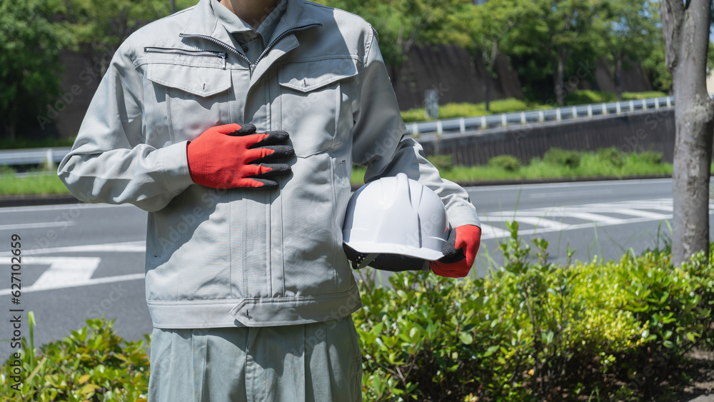 道路に立つ作業服の男性|建設業イメージ