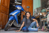 A young woman is sitting by a motorcycle parked in front of the entrance to a house