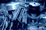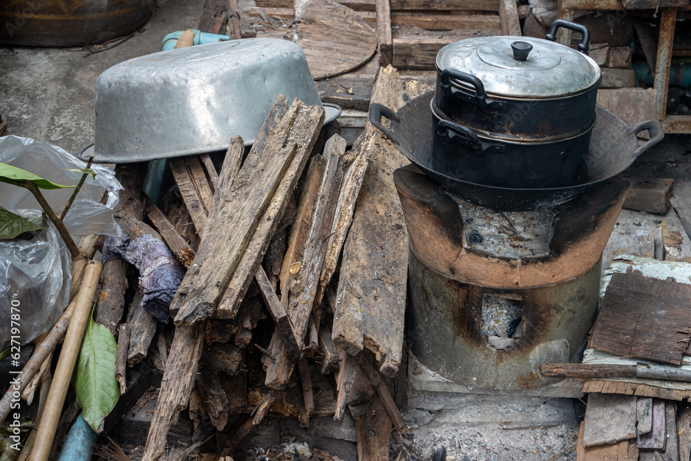 Traditional outdoor fire pit with dishware and wood in the backyard of a Thai household