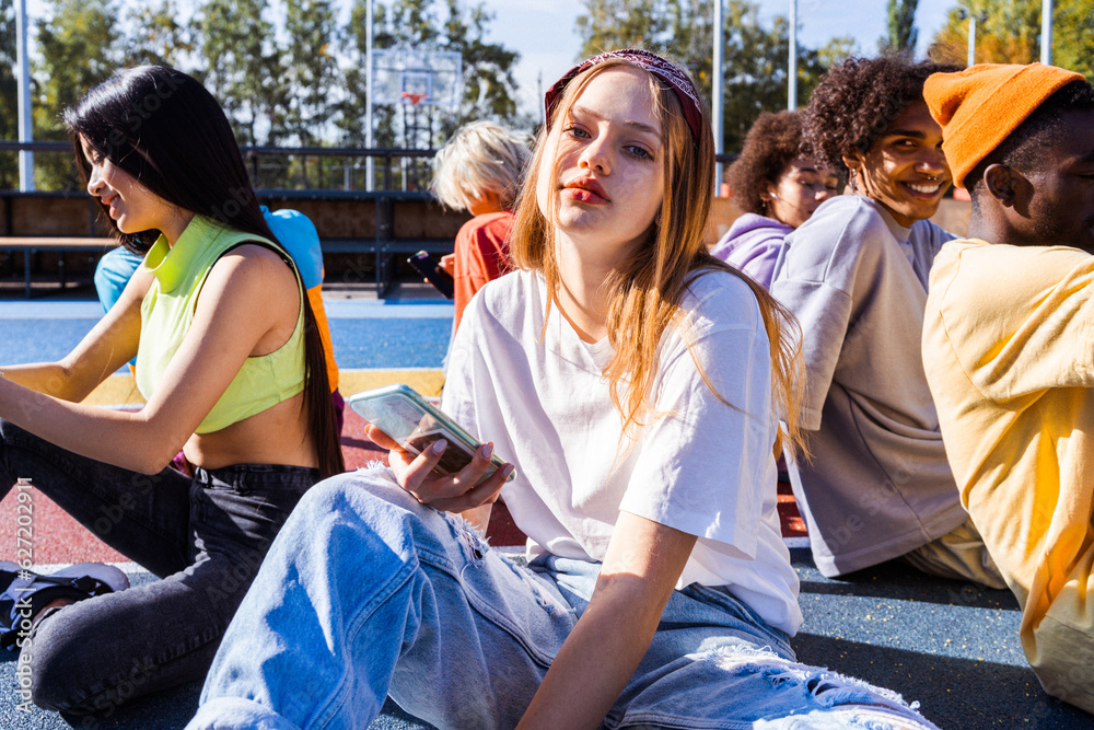Multiracial group of young friends bonding outdoors