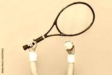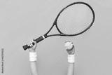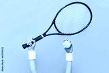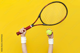 female hands raise and hold tennis racket and tennis ball on yellow background, sports equipment, close-up