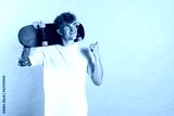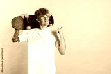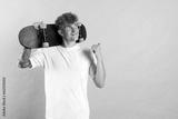 young cheerful tattooed guy in white t-shirt holds skateboard and smiles on blue isolated background