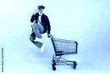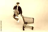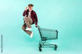 young crazy guy shopper jumps and rejoices with shopping cart from supermarket