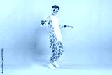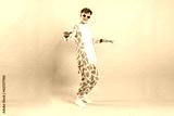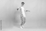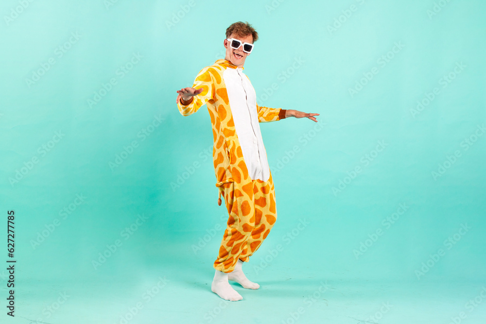 young funny guy in orange giraffe pajamas dances at party in sunglasses on blue isolated background