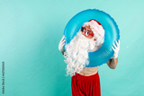 santa claus in suit with inflatable swim ring in sunglasses rests on the beach and points to the copy space