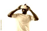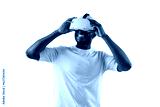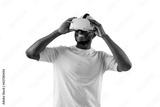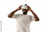 african american man in white t-shirt looks in virtual reality glasses and smiles on isolated background
