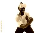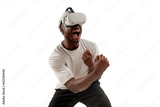 african american male winner in white t-shirt plays and wins in virtual reality glasses