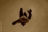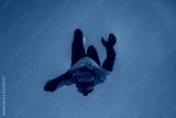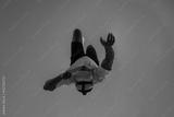 african american man in virtual reality glasses flies in the air and touches the imaginary in neon lighting