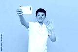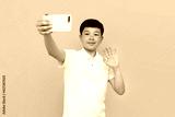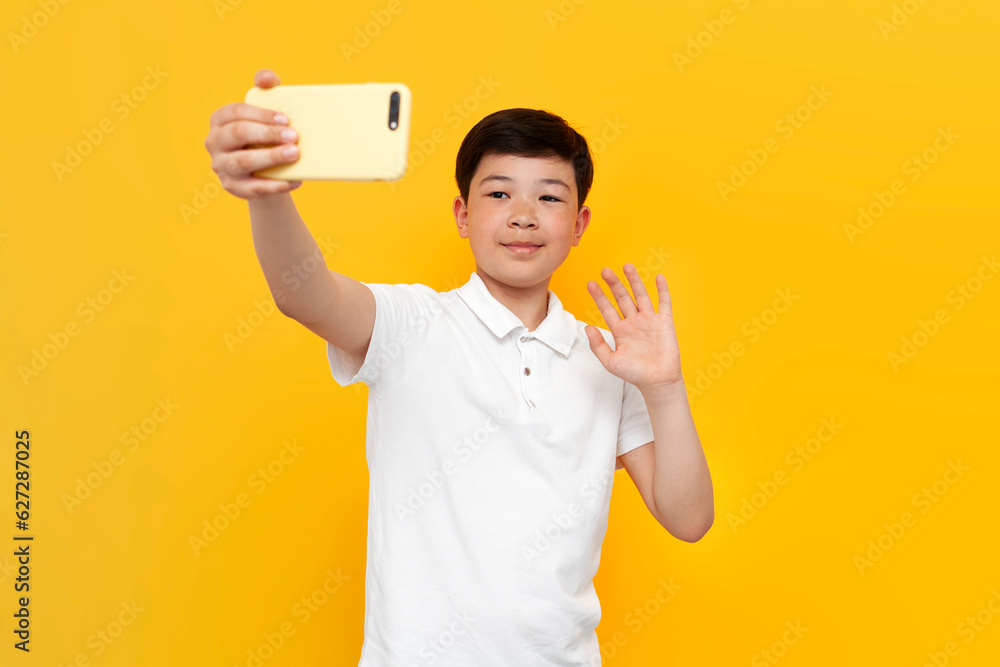 asian little boy of ten years old in white t-shirt is talking on video link and greeting on yellow background