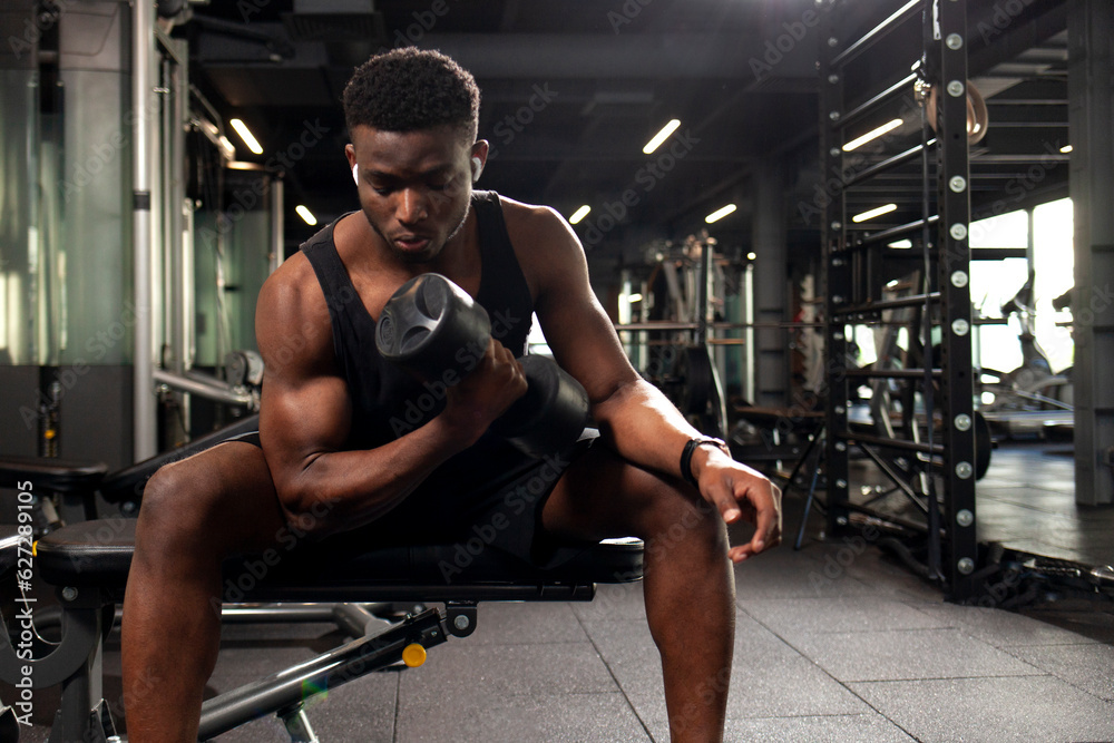 athletic african american man trains in dark gym, athletic guy lifts heavy dumbbells in fitness club
