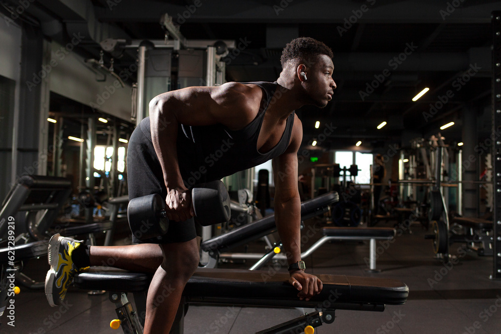 athletic african american man trains in dark gym, athletic guy lifts heavy dumbbells in fitness club