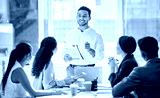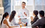 Staff, presentation and business man in a meeting, teamwork and planning with brainstorming, feedback and review. Presenter, group and team share ideas, collaboration and partnership with documents
