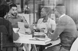 Meeting, collaboration and business people in discussion in the office while working together. Teamwork, planning and group of employees brainstorming with technology for a project in the workplace.