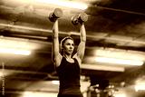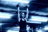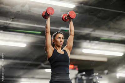 A muscular sportswoman in shape is lifting dumbbells over her head in a gym.