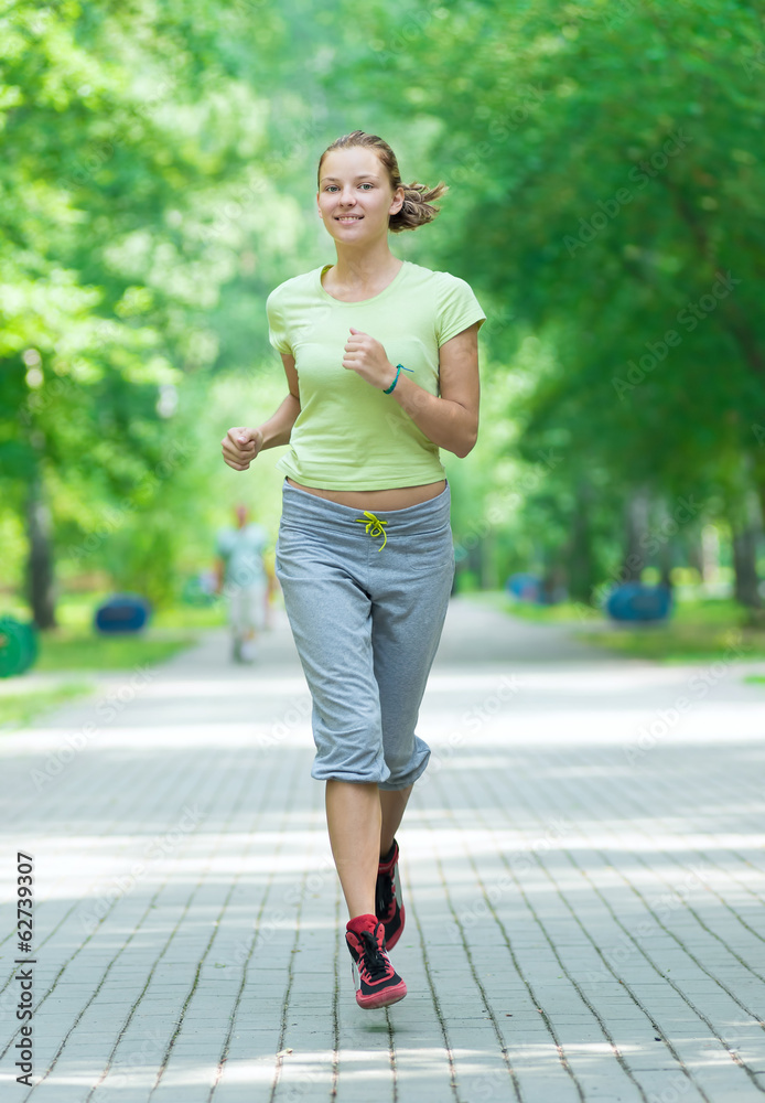 Woman jogging in city street park.