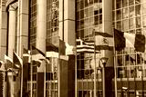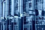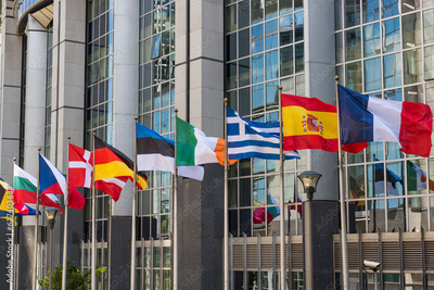Fluttering flags of the countries of the European Union in a row in Brussels, Belgium. Close up