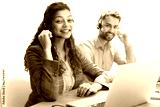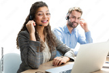 Portrait of call center worker accompanied by his team. Smiling customer support operator at work on a transparent background.