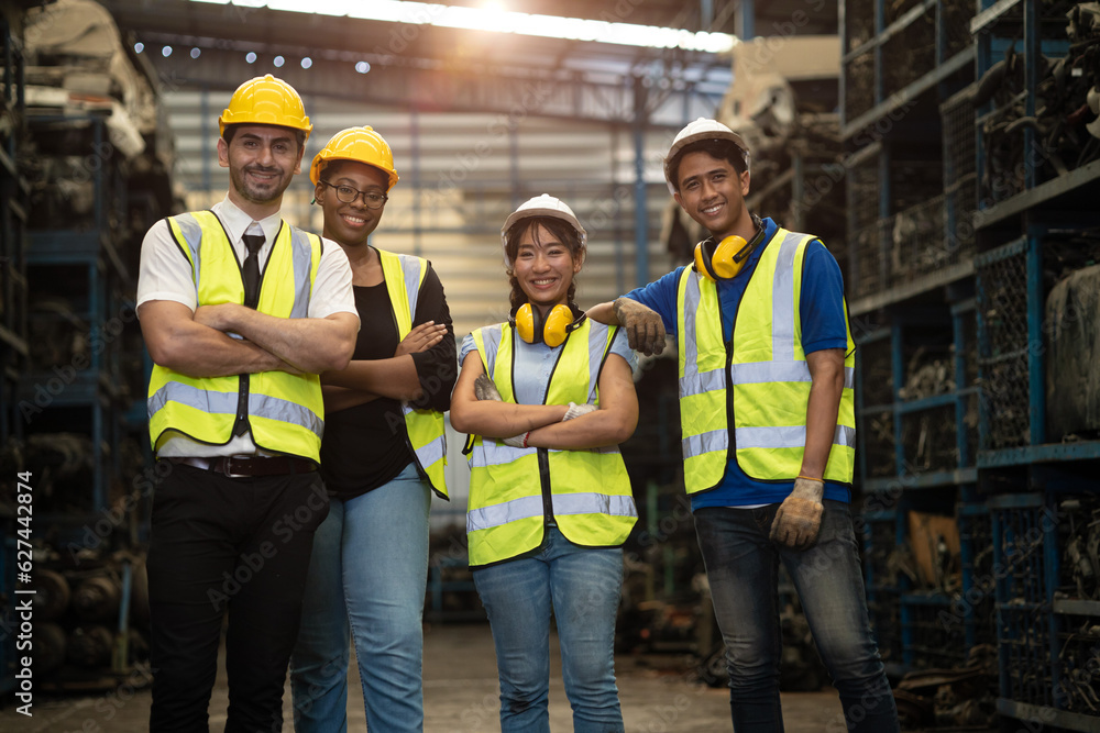 portrait group of engineer employee team staff group diversity worker together in dirty metal factory workshop background