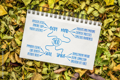 body, mind, soul, spirit and you concept, infographics or mind map in a spiral notebook, personal growth or development