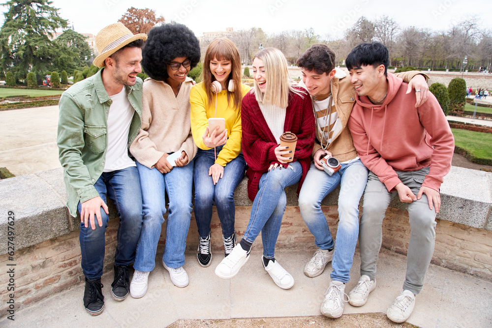 Group of multiracial students and laughing a lot while they share a phone and check multimedia. They look happy and friendly. They sit down on a bench outdoors.