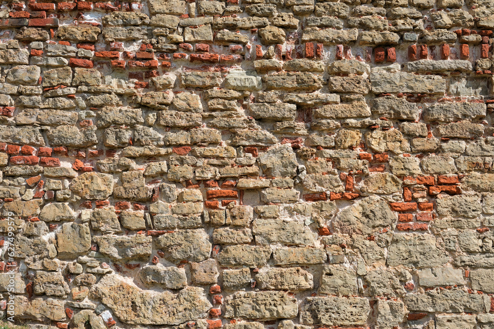 Old red brick wall background. Texture of an old ancient stone wall. Stonewall background.