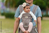crying infant in baby carrier with father in park