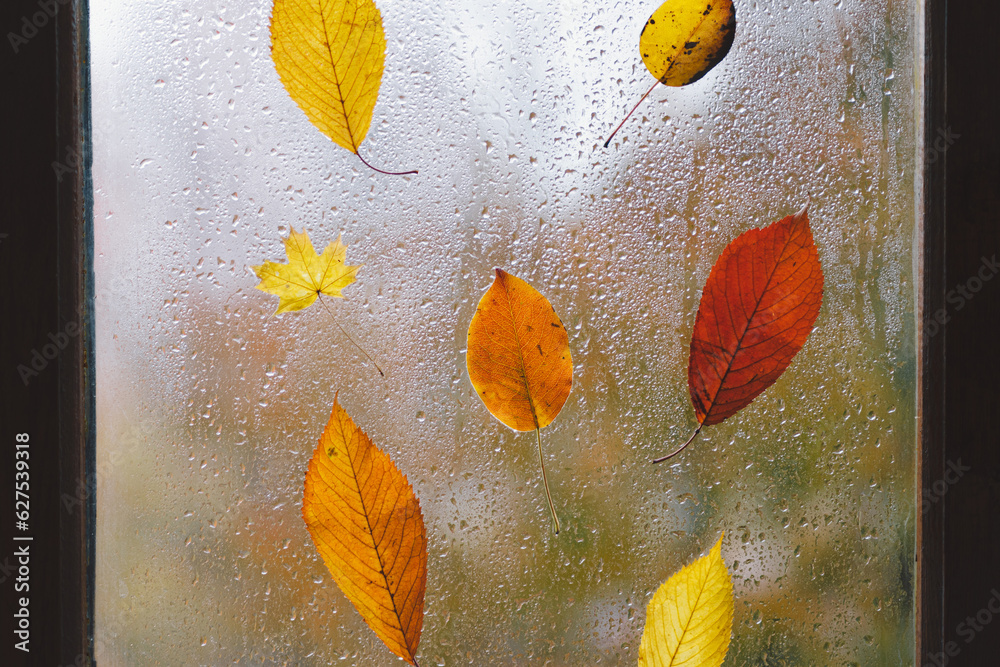 Autumn leaves stuck to the window that gets wet from rain drops. Autumn home decor. Cozy fall mood.