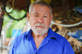 Portrait of an elderly gray-haired man with a beard and a blue shirt in a studio