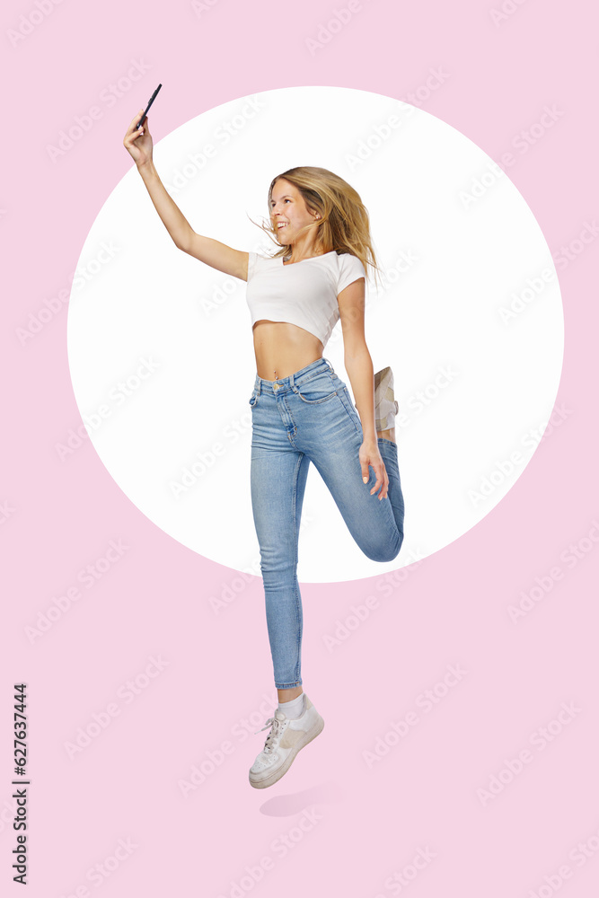 Full size photo of young charming lady model jump flying and takes selfie - isolated on pink background