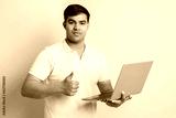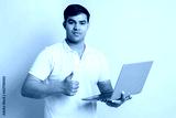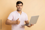 Young adult indian man in casual cloths holding laptop in hand doing thumbs up isolated on beige studio background. People lifestyle, Guy using computer.