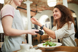 Cheerful excited young lady with curly hair sitting at table and paying for dinner with smartwatch while smiling at friendly waitress in restaurant
