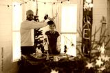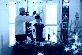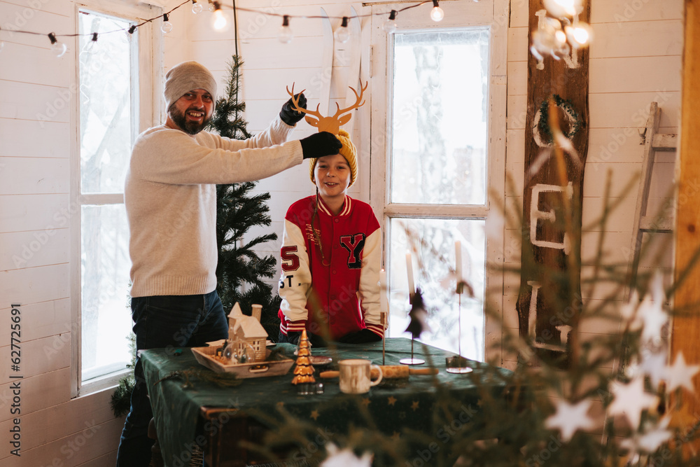 family man father and teenage boy son having fun in living room of cozy winter house, Christmas and New Year holidays and vacation