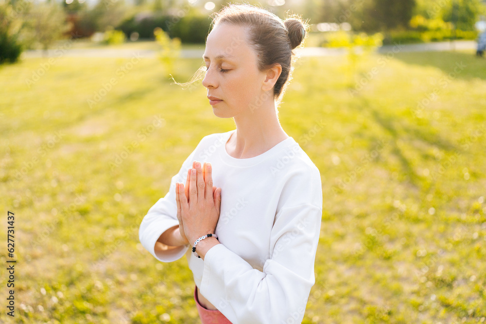 Close-up portrait of yogini female with emotion of serenity and tranquility performing Namaste gesture on nature, closed eyes. Carefree young woman meditating at city park on sunny summer day.