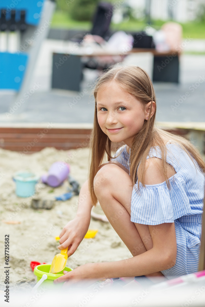 Little girl sitting in sandbox and playing. Outdoor creative activities for kids. Summer time